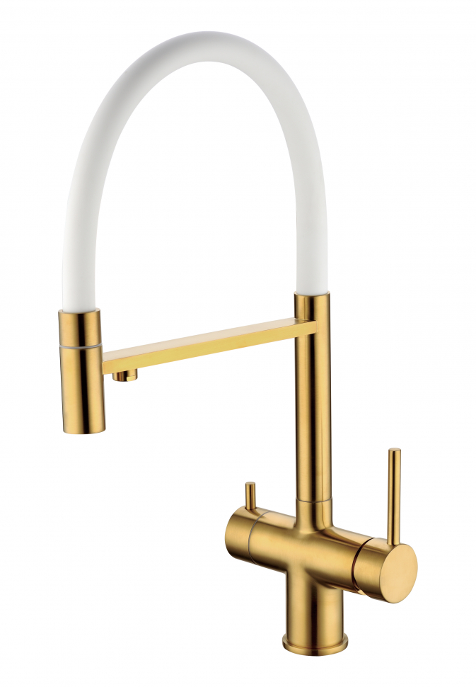 "GB4099GL Смеситель для кухни с подключением фильтра питьевой воды Цвет: Золотой брашированный Материал корпуса: латунь Керамический картридж Ø 35mm Переключатель: есть Аэратор: есть Аэратор для фильтрованной воды: есть Тип крепления: гайка Гибкая подводка: есть Переходник для соединения со стационарной системой питьевой воды: есть"