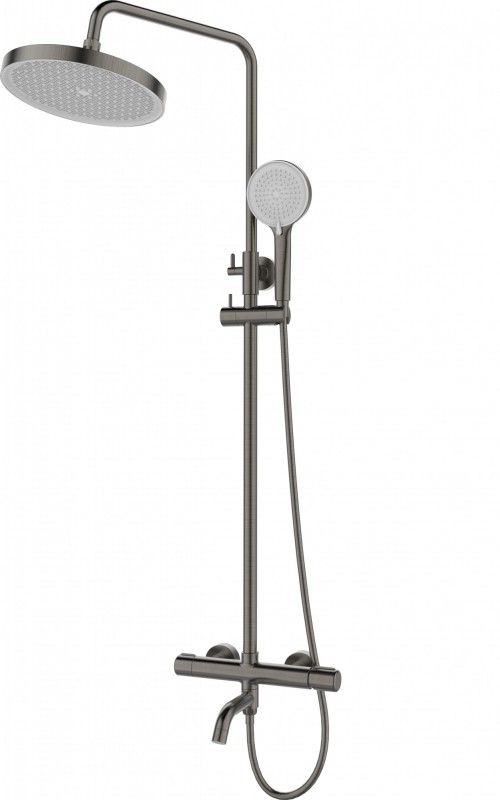 3-х режимная душевая система, телескопическая штанга (1068-1668), поворотный излив. Корпус смесителя - латунь. Надёжный керамический картридж. Излив - нержавеющая сталь (# 304). Верхний душ и душевая лейка из ABS. Душевой шланг: PVD. Длина шланга - 1,5 м.