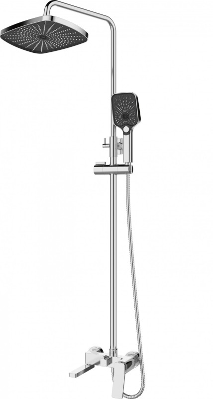 3-х режимная душевая система, телескопическая штанга (1070-1670), поворотный излив. Корпус смесителя - латунь. Надёжный керамический картридж. Излив - нержавеющая сталь (# 304). Верхний душ и душевая лейка из ABS. Душевой шланг: стальная оплётка с 2-м замком. Длина шланга - 1,5 м.