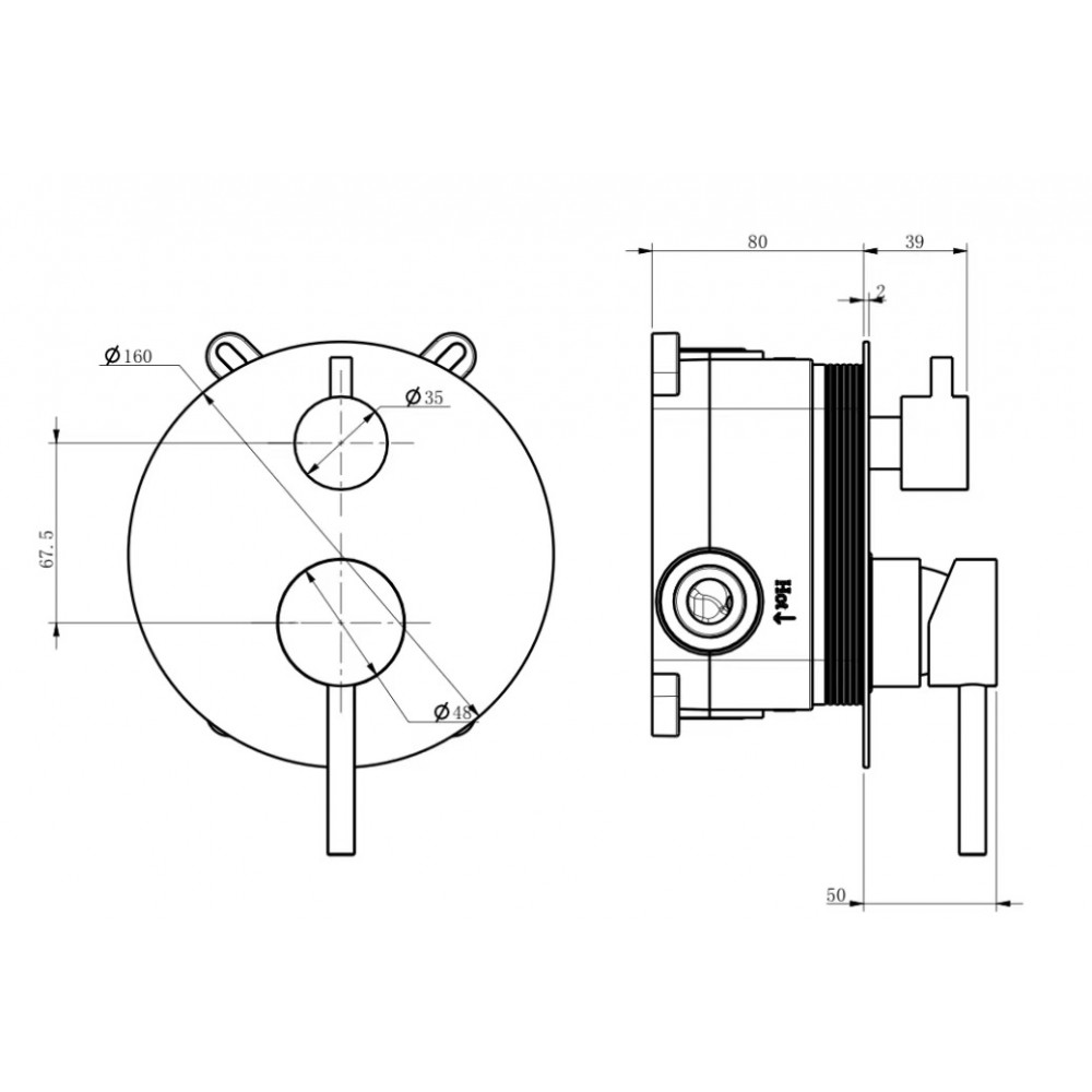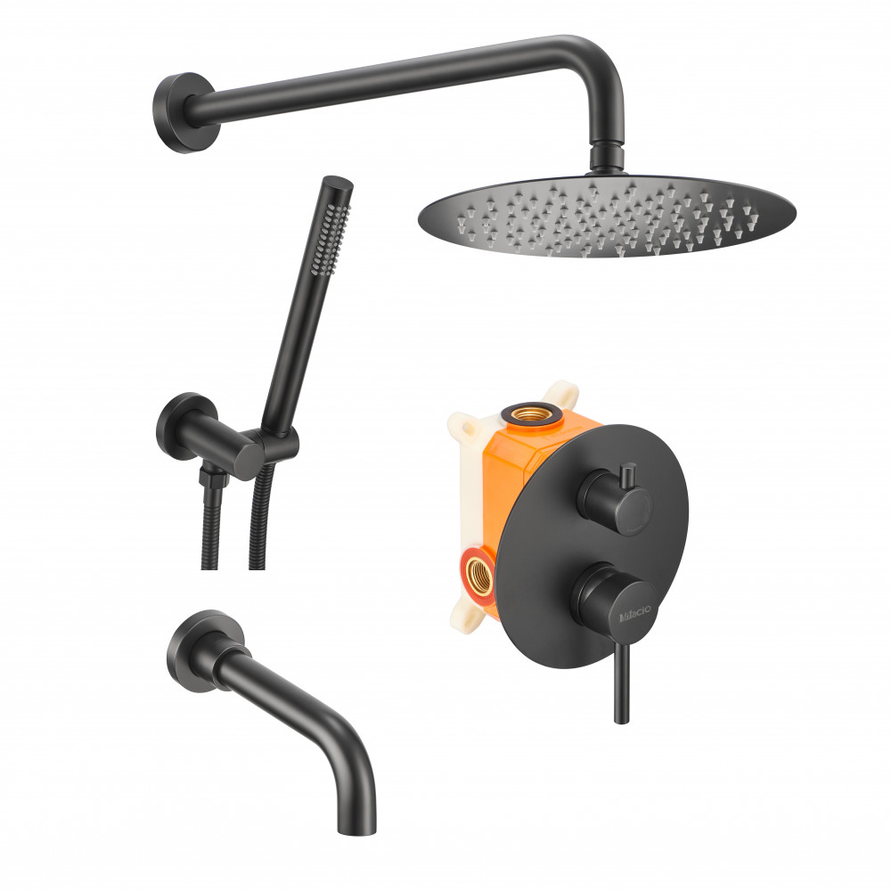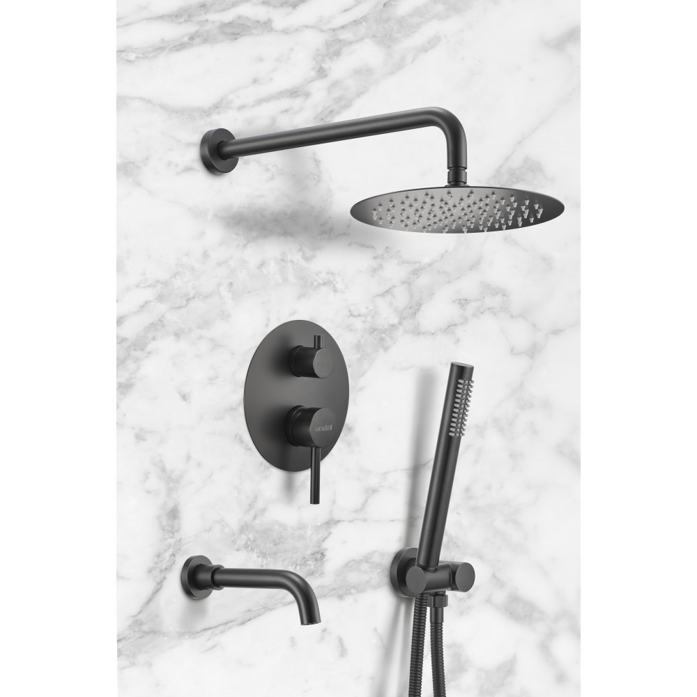 Смеситель скрытого монтажа - 1 шт. ; кронштейн верхнего душа - 1 шт. ; верхний душ - 1 шт. ; излив - 1 шт. ; держатель ручной лейки - 1 шт. ; ручная лейка - 1 шт. ; шланг - 1 шт. ; ручки управления - 2 шт. ; отражатели - 4 шт. ; накладка на переключатель режимов - 1 шт. ; паспорт - 1 шт.