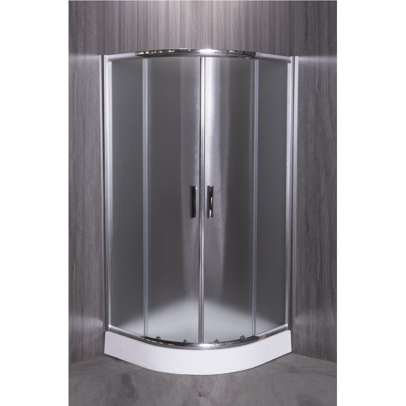 Уголок душевой. Низкий поддон; сифон с гидрозатвором; алюминиевый профиль, цвет: "глянцевый хром", стекло толщиной 5 мм, фактура: "мороз", двойные верхние ролики, регулировочный пристенный профиль 20мм. Стальные ручки.