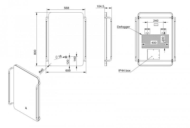 комплект креплений; антизапотеватель; встроенный светильник; выключатель; комлект подсветки; комплект боковой подсветки; комплект навесов;