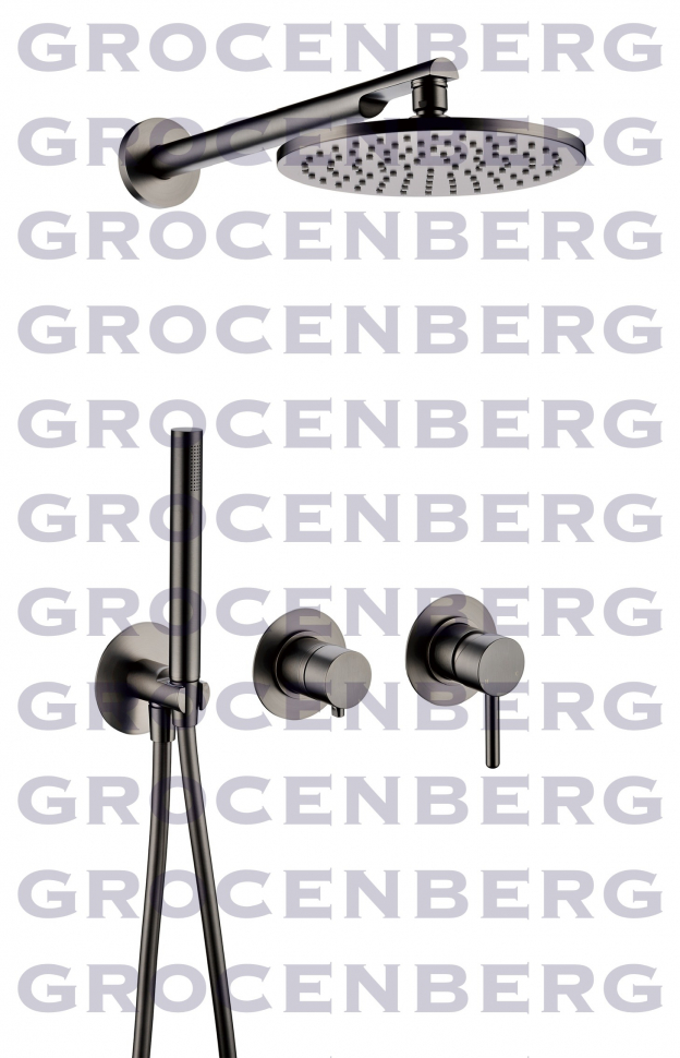 "GB5090BG Душевая система скрытого монтажа для душа с 2-функциями Цвет: графит (оружейная сталь) Материал корпуса: латунь Керамический картридж Ø 35mm Блок управления с переключателем Шланг: 1,5m Лейка: 1 режима (латунь) Тропический душ (латунь) Крепления ручного душа: есть (латунь)"