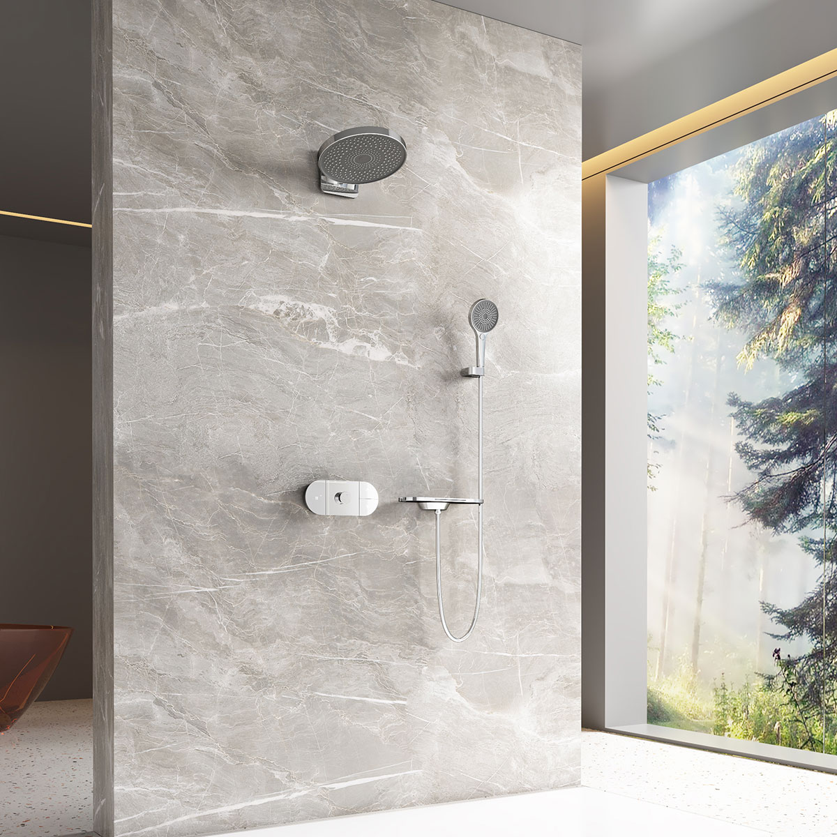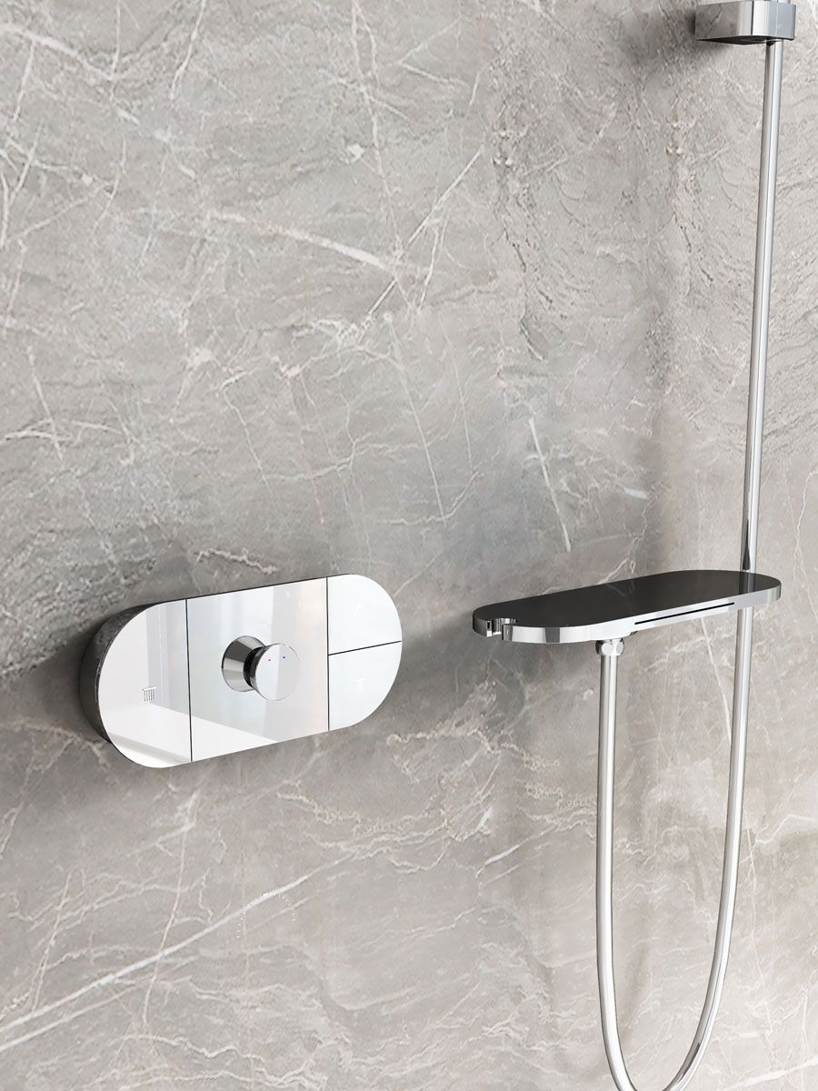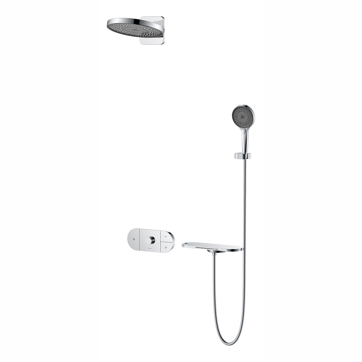 Верхний душ, полка с изливом и держателем ручного душа, ручной душ, смеситель со встраиваемой частью