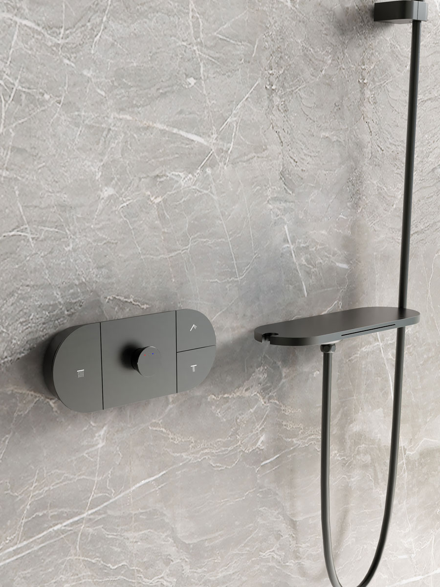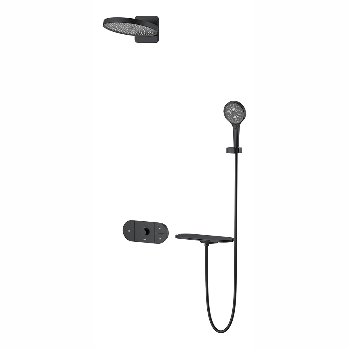 Верхний душ, полка с изливом и держателем ручного душа, ручной душ, смеситель со встраиваемой частью