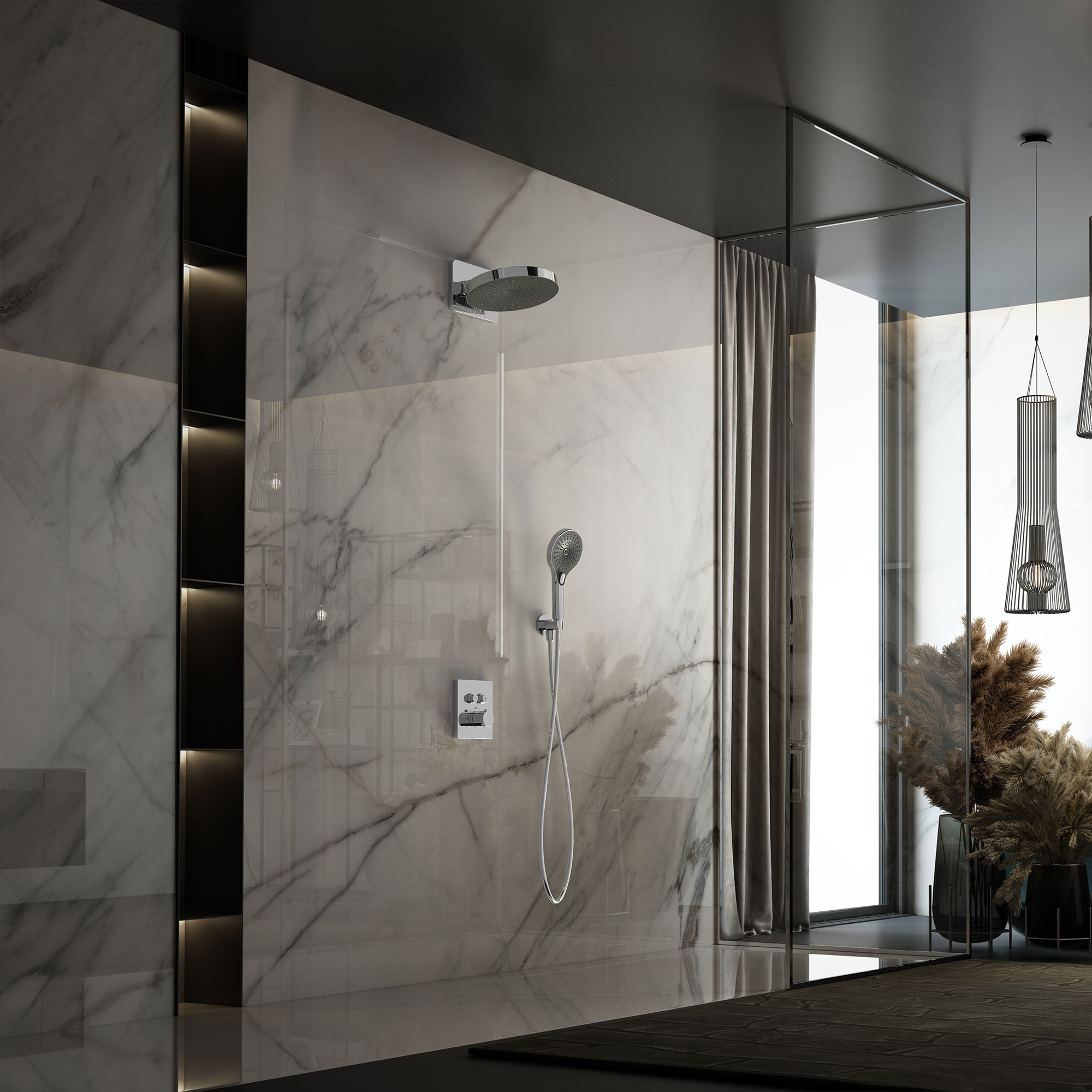 Верхний душ, полка с изливом и держателем ручного душа, ручной душ, смеситель со встраиваемой частью