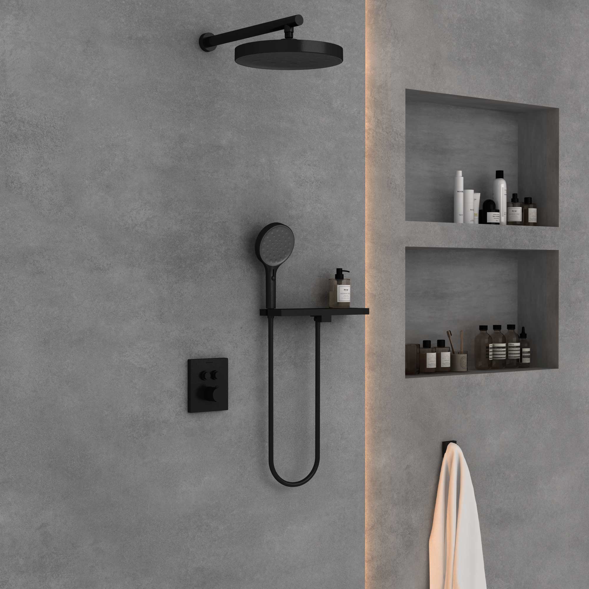 Верхний душ, полка с изливом и держателем ручного душа, ручной душ, смеситель со встраиваемой частью