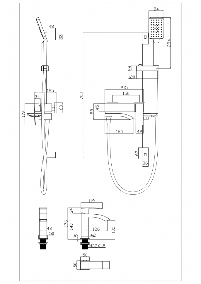 Смеситель, лейка, шланг, монтажный комплект.