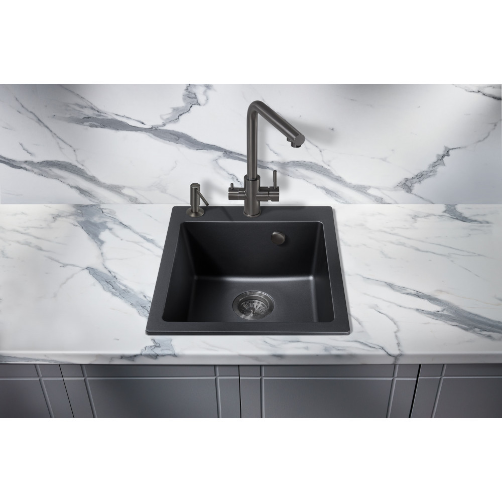 Раковина изготовлена из искусственного камня — кварцевого композита (кварц) — высококачественного материала, устойчивого перед царапинами, абразивами и механическими ударами. Кварцевая мойка не боится воздействия бытовой химии, света и высоких температур (кипятка и горячей посуды), благодаря чему сохранит цвет и форму на долгие годы вперед. При этом композитный материал нетоксичен и экологически безопасен: он не причинит вреда здоровью человека и окружающей среде. Кроме того, он обладает высокими шумо и виброподавляющими свойствами: мойка не гремит и не вибрирует в процессе использования.