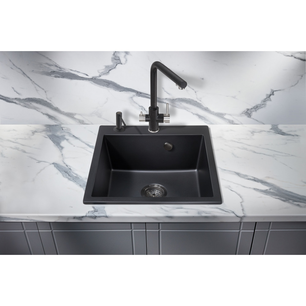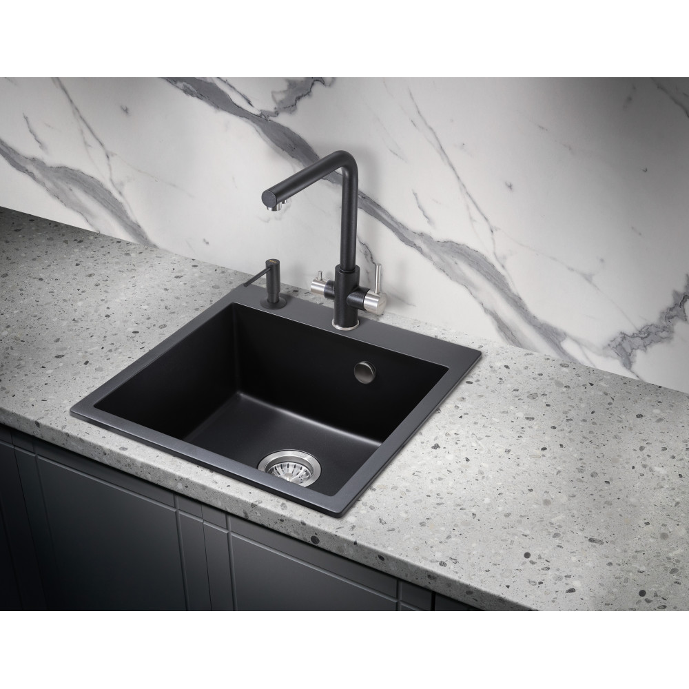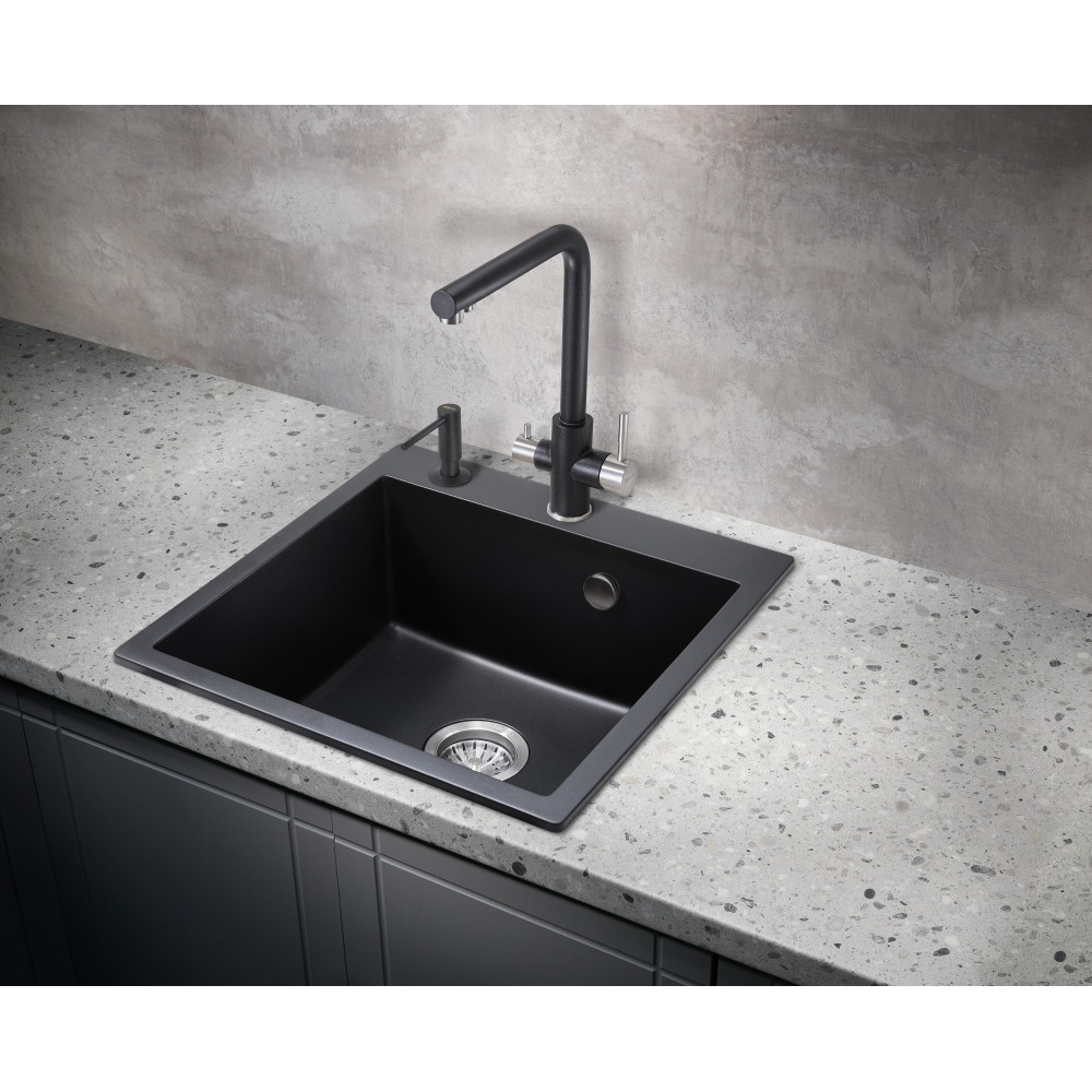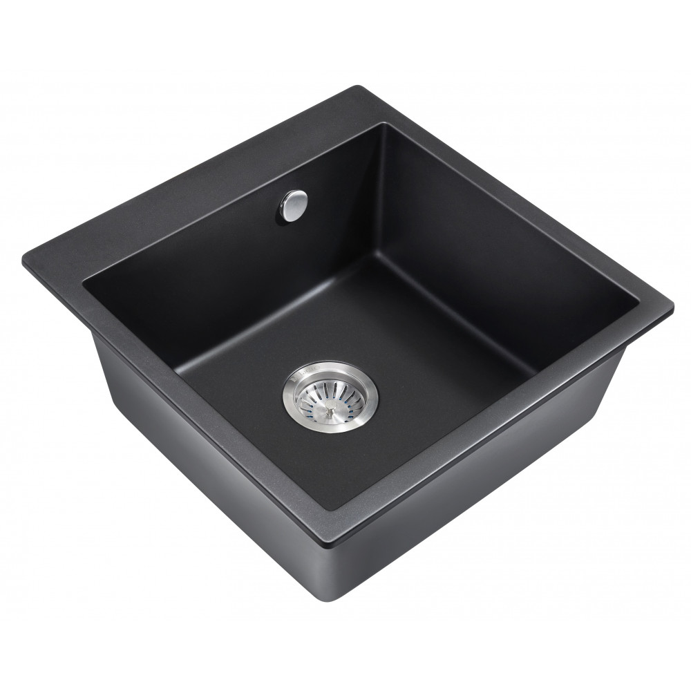 Врезная каменная прямоугольная мойка для кухни MILACIO Murcia 51 Cuarzo (MC.77021), выполненная в черном матовом цвете, станет украшением любой кухни — как классического, так и современного стиля. Раковина изготовлена из искусственного камня — кварца, или кварцевого композита, — твердого, долговечного материала, устойчивого перед любыми химическими веществами, экстремальными температурами и повреждениями. Имеет одну глубокую вместительную чашу квадратной формы, благодаря чему очень удобна в эксплуатации. Водоотталкивающее покрытие не дает каплям растекаться по поверхности, сводя к минимуму уровень загрязнения. А шумоподавляющие свойства материала не позволяют мойке греметь при наполнении водой и мытье посуды. Компактный сифон с выпуском и переливом сохранит много полезного места в тумбе под раковиной.
