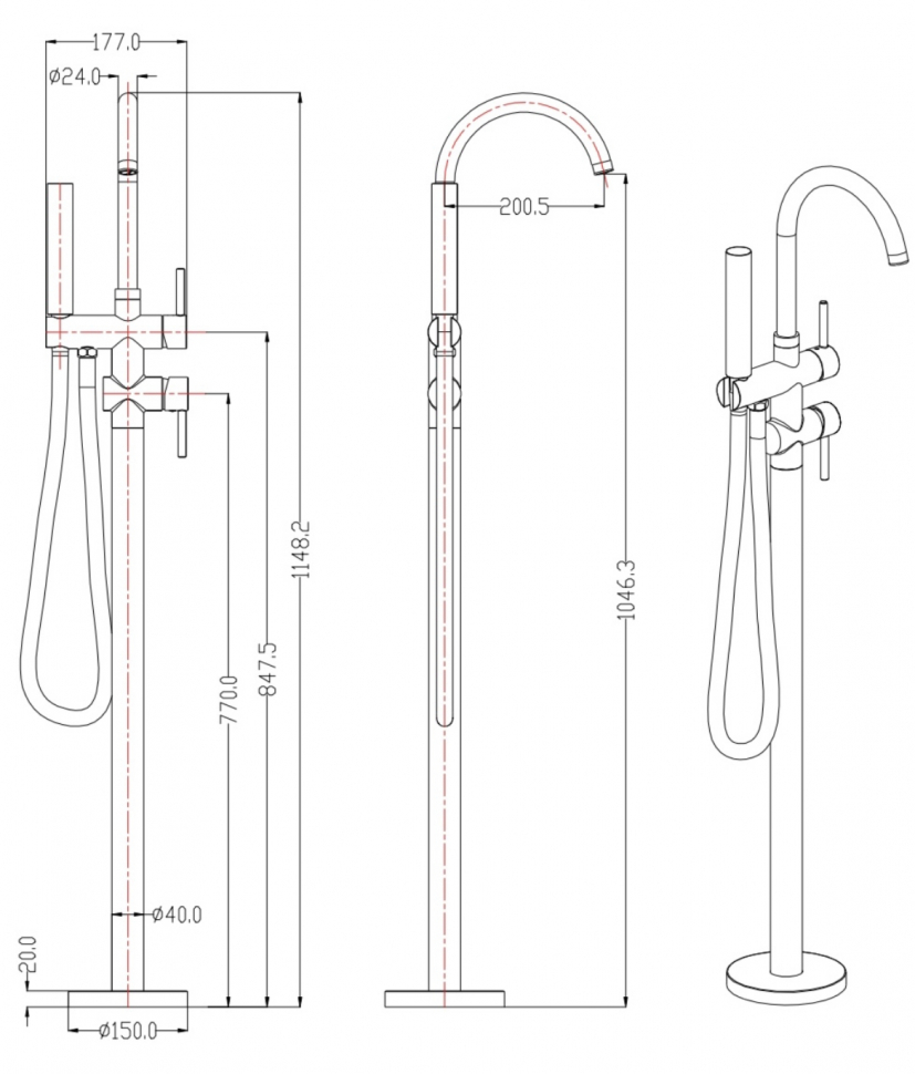 Смеситель, ручная лейка, стойка, монтажный комплект