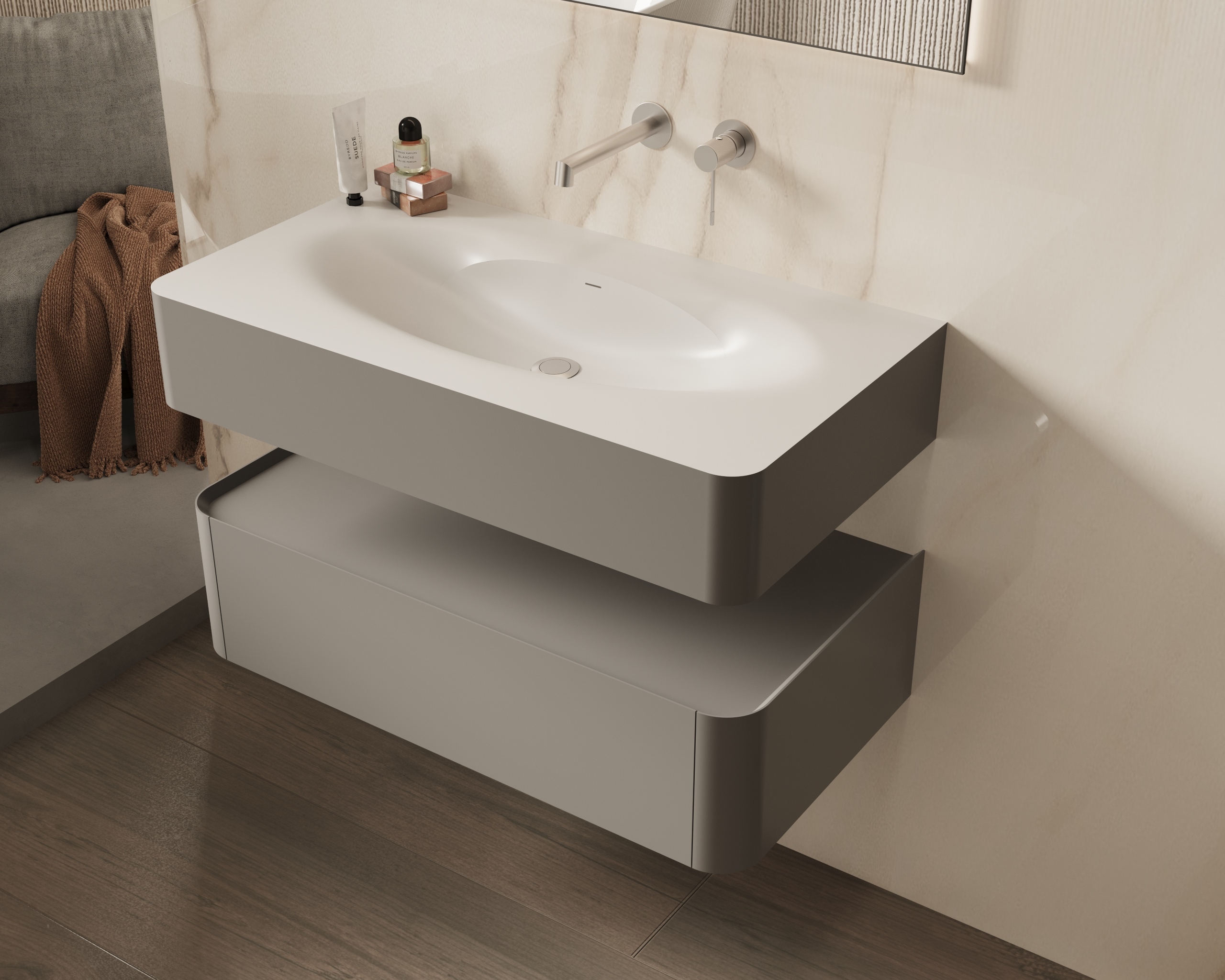 Мебель комплектуется раковинами из кориана, окрашенными в цвет тумбы
